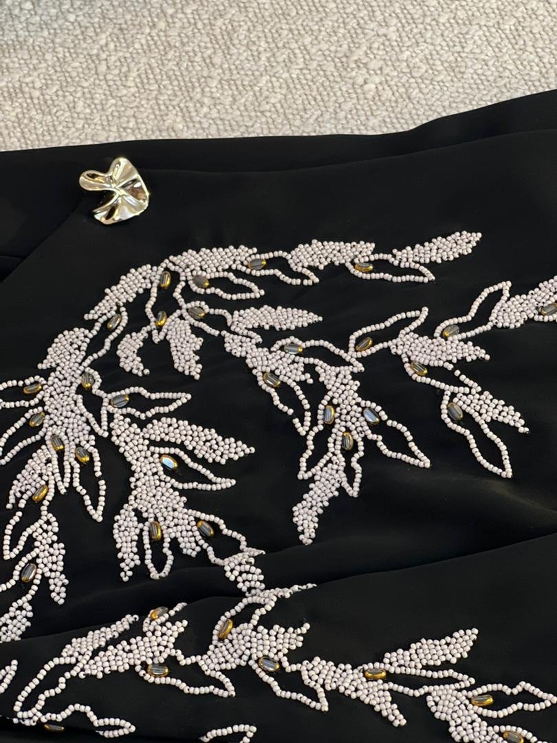 Flowing Pearl Detailing: Hand-applied pearls create a graceful, luxurious effect