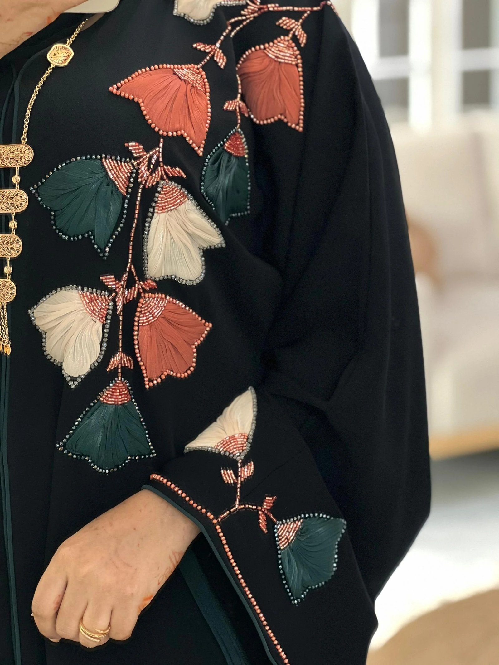 Pre-order the Midnight Bloom Abaya, handcrafted in small batches for timeless modest style. Featuring terracotta, cream, and deep green floral embroidery with delicate beads, made from premium Korean Nida fabric for a soft, lightweight drape. Comes with a matching chiffon sheila.